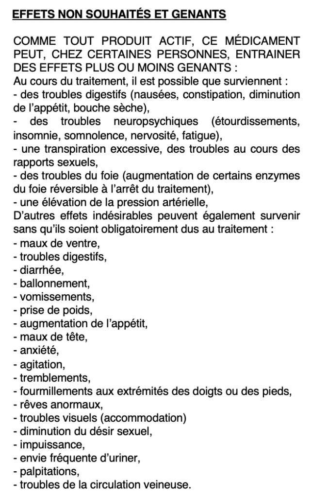 Pour m’aider à ne pas trop désespérer lorsque mon travail n’avance pas (dans ces cas-là, me vient sans cesse à l’esprit l’idée de me planter un bambou pointu dans le ventre — je ne sais pas pourquoi cette idée-là précisément), le docteur Moreau m’a proposé un anti-dépresseur. J’ai hésité, puis ai fini par accepter un essai. J’ai acheté la boîte ce matin, et la notice ne donne vraiment pas envie :
